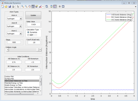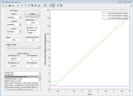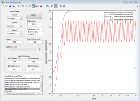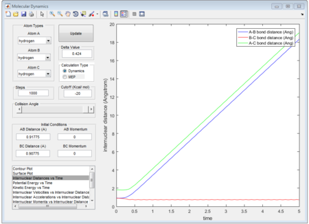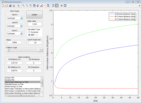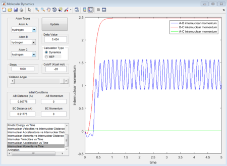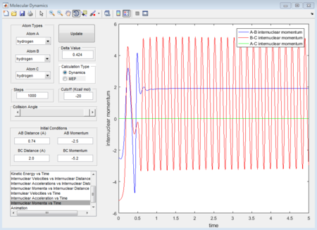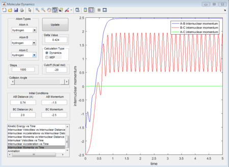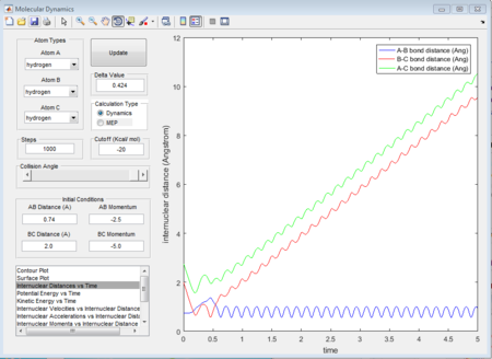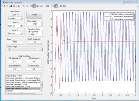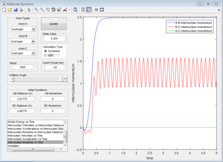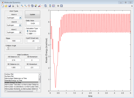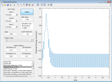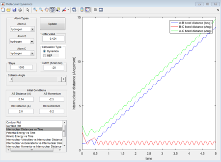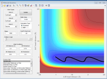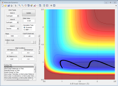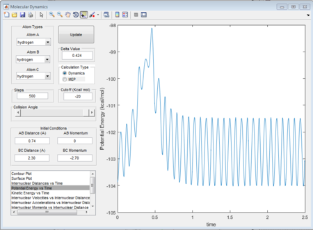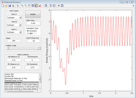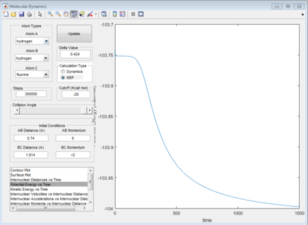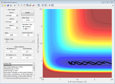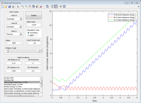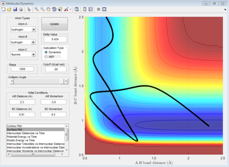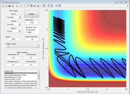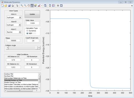 - A random initial conditions that results in a reactive trajectory for F + H2 can be set as r(HH) = 0.74A r(HF) = 1.855 p1 = 0 p2 = -2.5. The mechanism of release of the reaction energy is that when the approaching atom goes to the transition state there is a dramatical decrease tiwce in terms of kinetic energy (figure 37), followed by a comeback of vibrating conditions after that. See the potential energy (figure 38) of the whole system, it also shows a reverse process of kinetic energy with twice dramatic change increase and then comeback to a constantly vibrating circumstance. Therefore, based on the figure 39 as well, it can be concluded that the vibrational F atom with enough kinetic energy approaches the H2 molecule overcomes the transition state twice.
