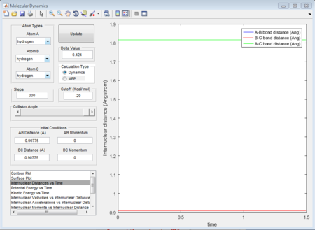 Due to H + H2 potential surface is symmetric, assuming the transition state must have r1 = r2 = 0.90775A (rts at the transition state position), the relative stationary state of motion is observed. If the approaching proton atom is placed at the ridge of potential surface, there is no gradient in the direction at right angle to the ridge; therefore the proton sphere would oscillate about that region without falling down. As shown in the figures below, one figure shows that the reactant proton is oscillating at the transition state position; while another shows that there is not any relative change in terms of the distance for the three protons against time.