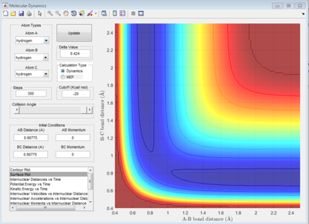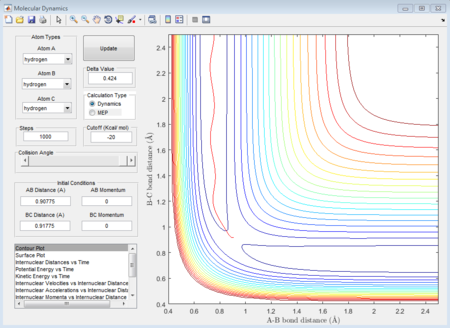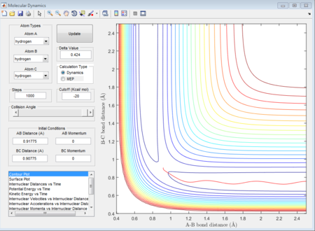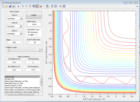 There is a contour graph when the distance between A and B is equal to 0.74 which is just like the normal bond length of a normal H2 molecule. In the H + H2 model, the initial conditions are set as r1 = 0.74 ,r2 = 2.30 and the momenta p1=0 p2 = -2.7.
