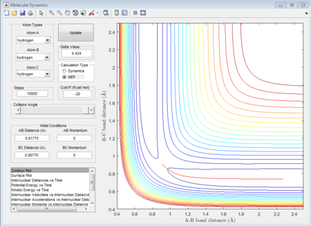 In this case, there is a little derivation from the transition state position, say 0.01A derivation for a first try, for one of the protons. The MEP calculation type is set so as to simulate the motion for this circumstance. The MEP contour plot is given below.
