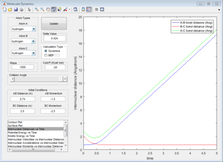- A acceptable value of a reactive path is r (HH) = 0.74A r (HF) = 2.30A p1 = 2.6 p2 = -0.5. In this condition, the fluorine atom approaches with a fairly small momentum. So there is a relatively long time for fluorine to get approach the transition state. Once the fluorine atom gets to the transition state, the hydrogen is being pushed away with another fairly long time again and then kicked away. We can see this from the internuclear distance vs time figure and this shows the whole process very clear.