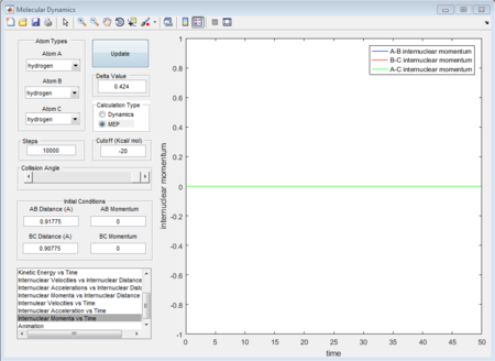 As shown in figure 33, when the total momenta in the whole system is zero, there is just a singlet point occurred in the trajectories meaning that these three atoms are in the transition state. Therefore, the internuclear distance for H and F (rts) is determined as 1.8135A.
