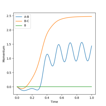 From the contour plots of r1(BC)= 0.9179 and r2(AB)=0.9079 respectively, you can see how the trajectory greatly differs depending on whether you set the calculation type to dynamics or mep. A Mep plot doesn't provide a realistic account of the motion of the atoms during the reaction as it takes the vibrational energy to = 0. As a result, you can see a straight line representing the trajectory on the graph on the top. By contrast, the dynamic plot shows how the trajectory of the reaction oscillates as it takes into account the vibrational energies the atoms possess. The momenta vs time plots illustrate this concept more clearly by demonstrating how the momentum of the system is constant regardless of the values you input for p1 and p2 in the mep representation (bottom graph). However, the momentum is seen to change with time in a dynamic plot as although it takes the translation energy to = 0 (i.e. p1=p2=0), it accounts for the vibrational quantised energies of the molecules which accounts for the variation in momentum (top graph).