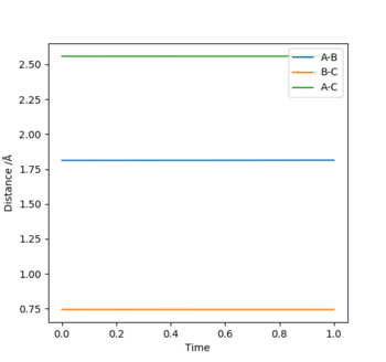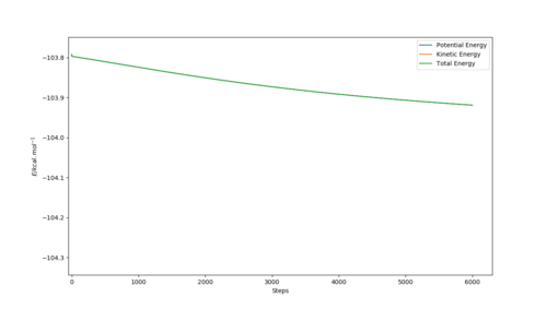 A plot of Energy vs Time under the reaction conditions described above demonstrates how the total energy of the system is conserved as it remains constant, depicted by a straight green line in the following graph: