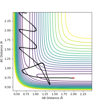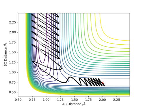 The initial distances where unchanged throughout with r1 (BC)= 0.74 Å and r2 (AB) = 2.0 Å; the red cross on the plots represents the start of the trajectory.