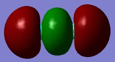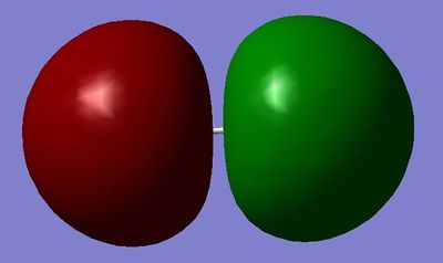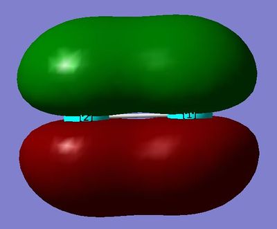 MO17 and MO16: This Molecular Orbital is the HOMO and is created from the linear combination of 3p orbitals in Chlorine. It is relatively high in energy, and is a π*g orbital. It would act as the lone pair in a nucleophilic attack initiated by the chlorine. There are two of these orbitals, identical to each other in every respect except spatial orientation.