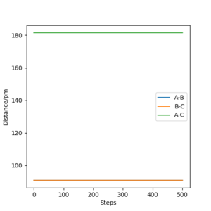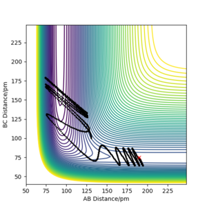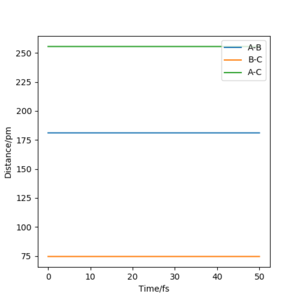 The plot of “Inter-nuclear Distances vs Time” is illustrated as well as the Contour plot. The “Inter-nuclear Distances vs Time” plot illustrates two straight lines that prove that the bonds AB and BC do not change in the transitions state thus the values found were correct. This is seconded by the fact that in the contour plot no trajectory is shown, just a point.