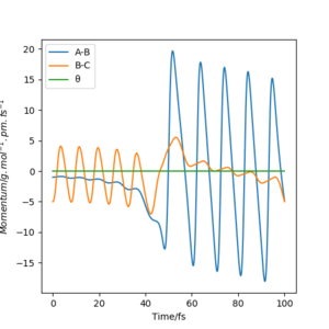 One reactive trajectory for the reaction for F + H2, was found to be at rAB= 190 pm, rBC= 75 pm, pAB = -1 kjmol-1.pm.fs-1, prBC= -5 kjmol-1.pm.fs-1 The above reaction is exothermic thus energy in the form of heat is released into the system upon completion of reaction. By inspection of the contour plot we can see that the molecule H2 is approaching the Fluorine atom with intense vibration. Upon collision of the molecule with the atom, a bond is formed between the fluorine atom and the hydrogen resulting in HF molecule and atomic Hydrogen. The HF molecule is now vibrating more intensily than before. By looking at the Momenta vs Time plot we can observe that the total momentum of the system remains constant thus the total energy of the system is constant, but the kinetic and potential are alternating.