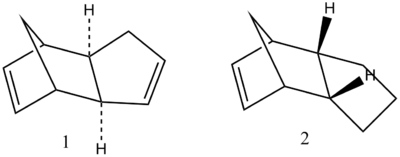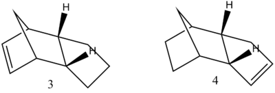 As deduced previously, the endo-isomer is the major product of dimerisation. The partial hydrogenation of this isomer can yield either the dihydro derivative 3 or 4 [shown below]. By comparing the relative energy contributions present within each molecule one can make a thermodynamic prediction regarding the ease of hydrogenation of each double bond in 2 [endo].