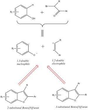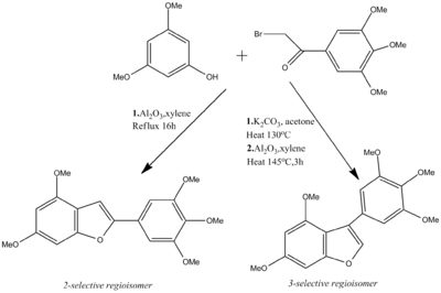 A recent research study has established a convergent and regiocontrolled synthesis of 2- or 3-substituted benzo[b] furans using ortho-substituted phenols and α-bromoacetophenones. The 2-selective isomer can be obtained through a one step process using xylene [under reflux] and neutral alumina, whereas one can yield the 3-substituted regioisomer in two consecutive steps [heating with potassium carbonate and acetone, followed by the addition of alumina]. [8].