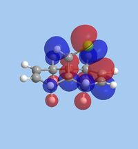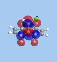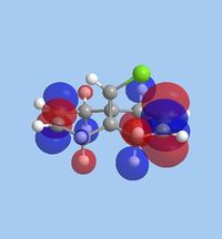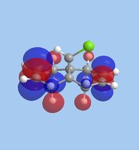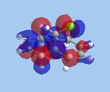 The reactivity observed within this reaction can be attributed to the specific interactions occurring within the HOMO-LUMO region. The most pertinent interaction is that of the HOMO-1 [exo-,electrophilic π bond] and LUMO+2 [C-Cl σ*]. An optimal orbital anti-periplanar alignment is present between these two orbitals,allowing an impulse of electron density into the C-Cl σ* bond increasing the "bonding" nature of the C-Cl σ* bond. [5]. Conversely, this overlap results in an increase in electron density on the exo-π bond, which is pushed into the anti-bonding π* orbitals of the alkene. The endo-π bond more is rendered more nucleophilic with regard to both frontier orbital and electrostatic analysis. The electrostatic potential of 9-chloromethanonapthelene displays a distinct perturbation of electron density, with a greater proportion of density surrounding the nucleophilic endo-π bond compared tor the exo-π bond. This is shown below: