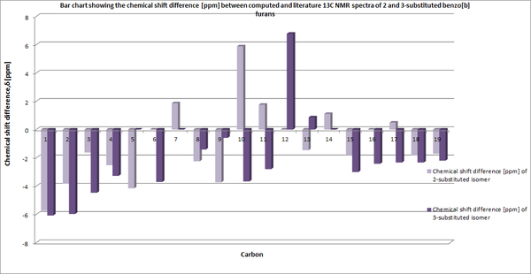 In analysing the computed values with those of reported in literature, significant discrepancies become apparent. Although a relatively small ppm range of +/-7 is observed, given the 19 carbon atoms within each regioisomer one would expect 19 carbon shifts to have been stated in literature. Yet, in the case of both regioisomers fewer carbon shifts are reported. In the 2-substituted isomer, 16 peaks were reported and within the 3-substituted isomer only 15 peaks were reported. This apparent absence of peaks within literature can perhaps be attributed to the carbon shifts being grouped together within literature [i.e one shift value corresponding to more than one carbon]. Furthermore, the diminished intensity of chemical shifts due to quaternary carbons may have resulted in unobserved or at least undistinguishable peaks within the experimental 13C NMR spectra.