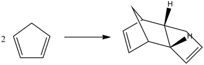 Cyclopentadiene is susceptible to dimerisation, undergoing a Diels-Alder 4πs+2πs cycloaddition, to produce either an endo or exo form. The exergonic ΔGo component associated with this reaction, reflects the favourable nature of dimerisation. The two π-bonds within one cylopentadiene ring [fixed in the s-cis conformation] react with one π-bond in the second cyclopentadiene ring to a partiallly hydrogenated dimer structure.