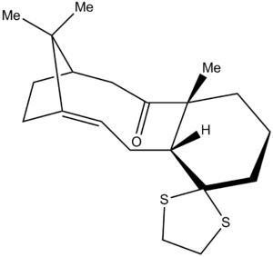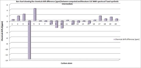 As seen in earlier discussions, the energy of two atropisomeric Taxol intermediates were computed and analysed using various compuational methods. For the forthcoming section of the investigation, the lower energy conformer [shown below] was considered. Using computational methods, the 13C NMR of this Taxol synthetic intermediate was simulated and compared to that in literature[7].