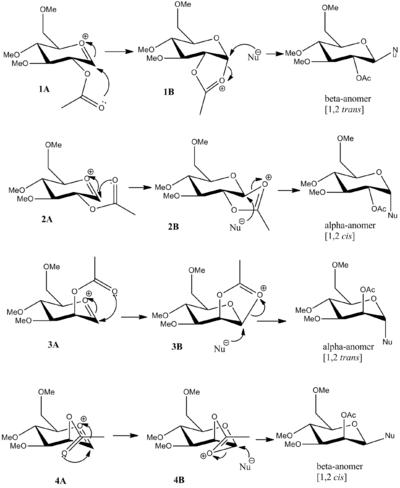 In the case when the 2 position of the 2-acetylpyranose is occupied by an acetyl group, either below or above the plane of the ring [1A-4A], an intermediate acetoxonium cation can be formed due to neighbouring group participation [1B-4B], stabilised by resonance within the heterocycle ring [1B-4B]. The formation of the acetoxonium intermediate [1B-4B] hinders the nucleophiles access to and overlap with the C-O σ* bond on the intermediate. In the specific case of the cis forming α- and β- anomers [2B and 4B] this inaccessibility within the acetoxonium intermediate [2B and 4B] is very prominent, hence the trans isomers are the principal route observed compared to the cis products.