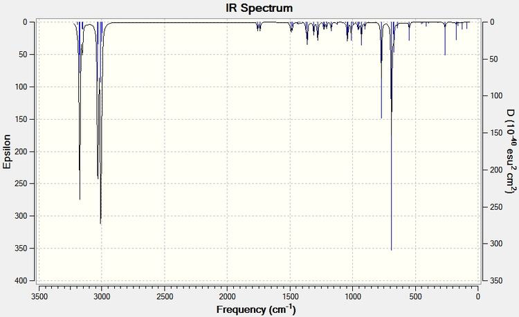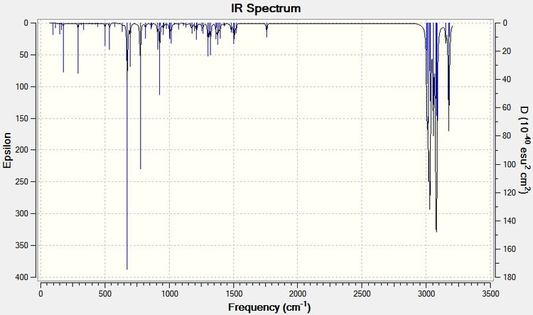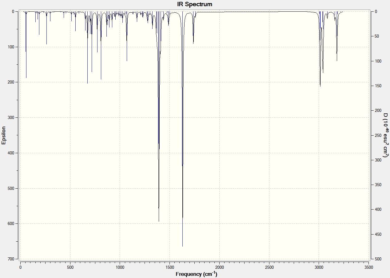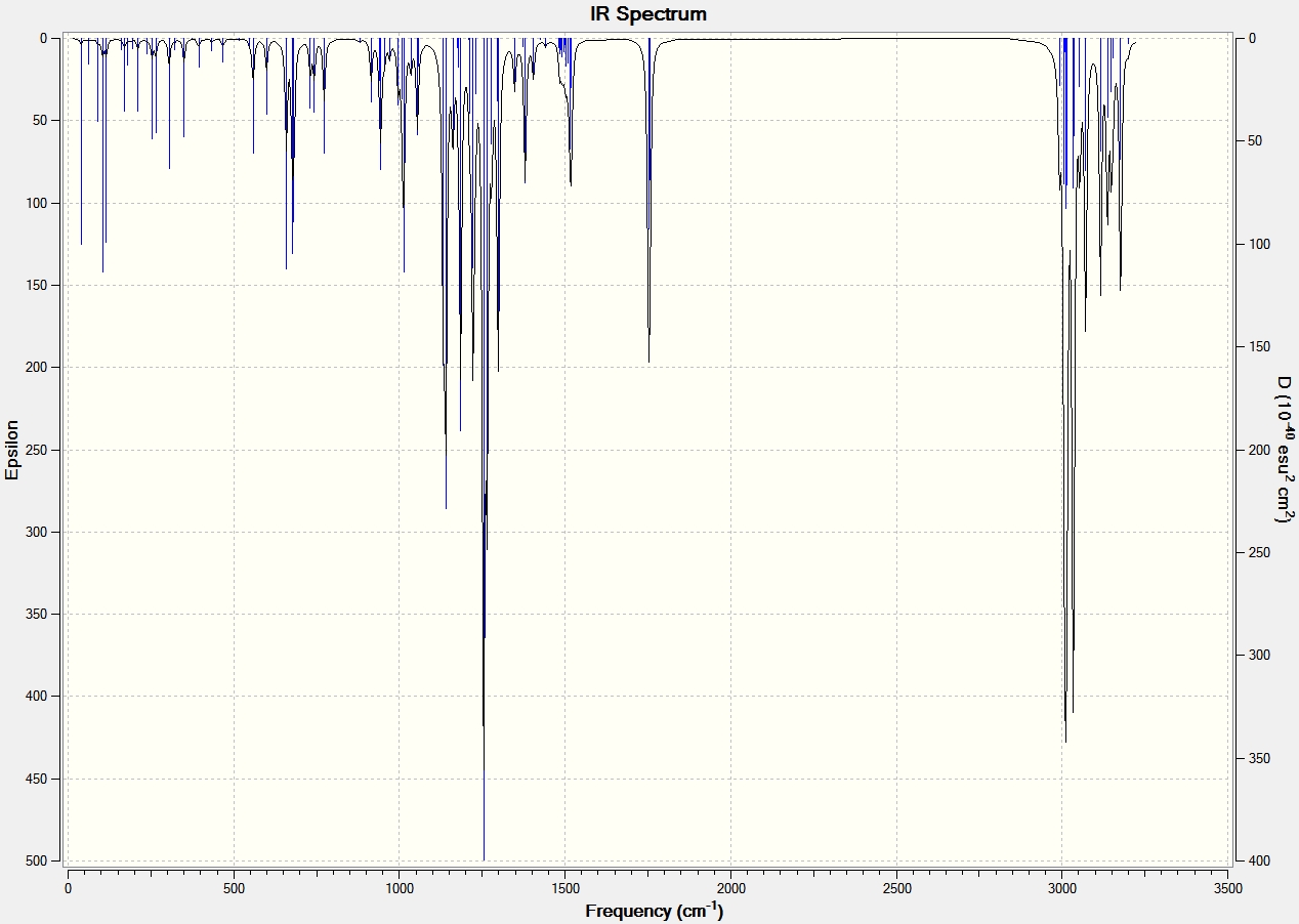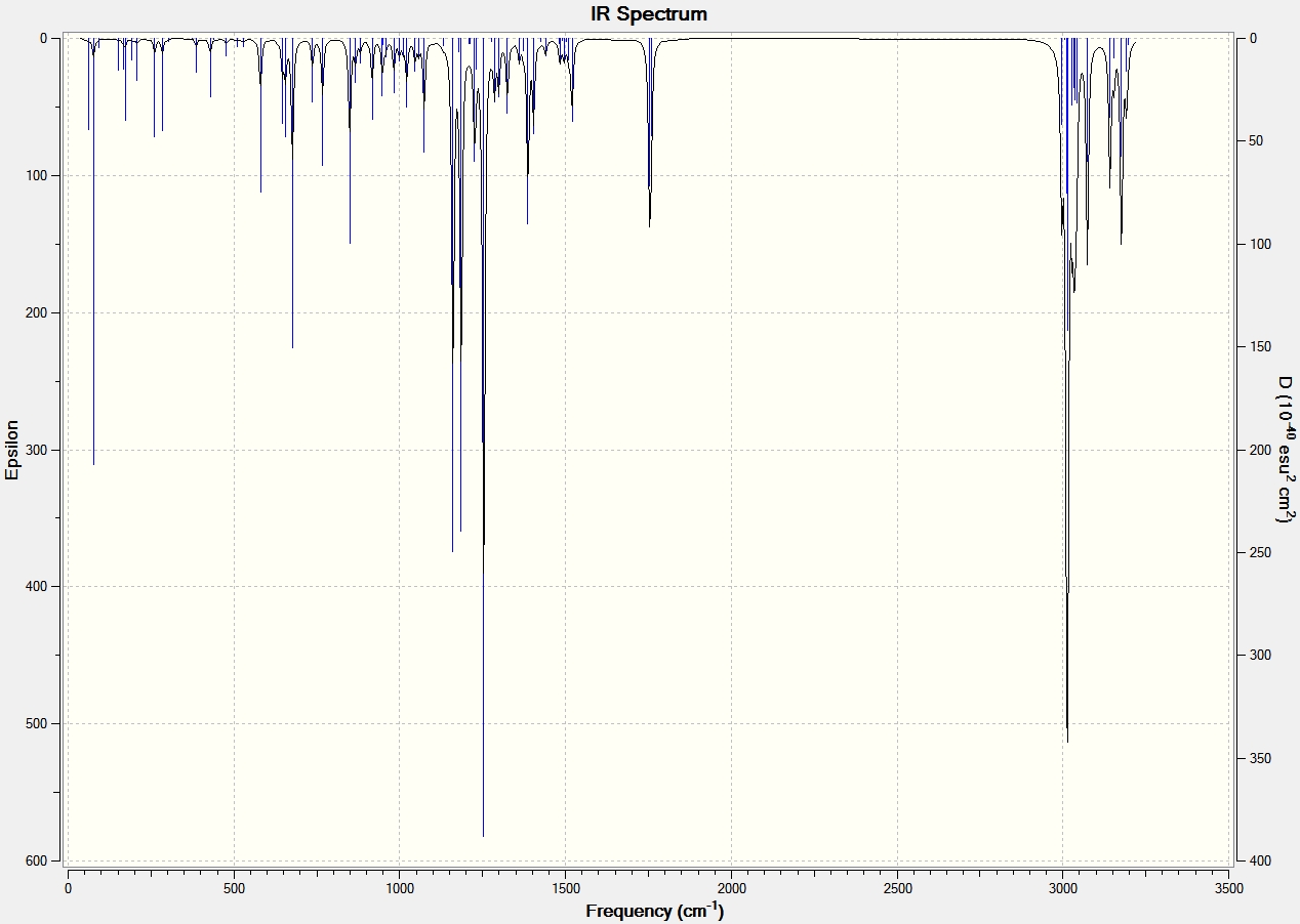 To analyse the effects of the presence or absence of the anti alkene we must use the Simple Harmonic Oscillator equation: ν = (1/2π)*(k/μ)0.5 [6]. This shows that as the strength of the bond increases (force contant k), the frequency of its vibration also increases. The IR Spectra below were generated by optimizing the geometries of the molecules by first using MM2, MOPAC, then using the Gaussian geometry optimization. Having found the optimized geometry the molecule was to SCAN to generate a vibrational spectrum on GaussView 5.0.