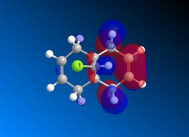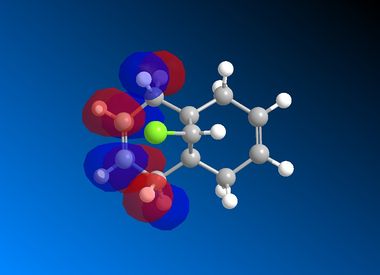 It is clear from the results above that both AM1 and GaussView suggest the HOMO for dichlorocarbene is located on the syn alkene. It is this orbital which is most important for the reaction of dichlorocarbene with an incoming electrophile because it is where the electrons of the highest energy are located (i.e. most nucleophilic). This explains the selectivity for the carbenylation of dichlorocarbene for the syn alkene over the anti alkene. There is also an obvious and expected trend in that as you go down the table from HOMO-1 to LUMO+2 the number and size of bonding interactions between orbitals decreases. One very striking molecular orbital is the LUMO+2, it strongly resembles the structure of a σ* orbital, and it is very likely to be the C-Cl σ* antibonding orbital. This orbital is a particularly good electron acceptor due to the electronegativity of chlorine making the carbon electron deficient. As a result of this a stabilising interaction is likely to form via donation of electrons from occupied π orbital of the anti alkene into this σ* orbital. This prediction can be confirmed by use of computational methods, by producing IR spectra for the dichlorocarbene and the monohydrogenated molecule to see the effect on the C-Cl vibrational frequency.