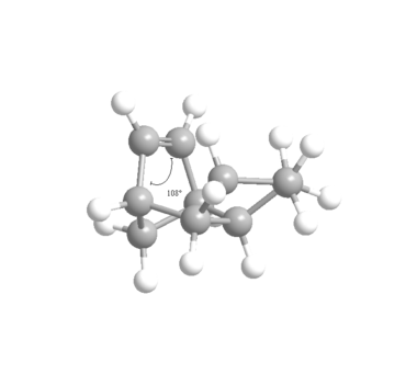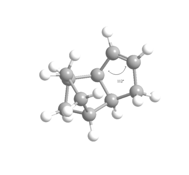 It is clear from the above that Hydrogenated Product (4) is the more stable, thermodynamic product since it is 4.52kcal mol-1 lower in energy than Product (3) . The bending interaction is the major contributor to this difference in energy, along with 1,4 Van der Waals interactions which provide a smaller difference in stability. But it can also be seen from the Table 3 that torsional strain is higher in Product (4). With the aid of the Jmols of each of the products and the figures below it is clear to see where the difference in the Bend energies comes from. The ideal geometry for an sp2 hybridised centre is 120°, deviations from this ideal angle will cause an increase in the Bend energies seen in the MM2 calculations. Product (3) has angles of 107.8 and 107.8° compared to 112.4° and 113° in Product (4), although both structures have considerable strain the former has a more compressed bond angle and so has a higher bend energy (4.52kcal mol-1). It is also important to note that more important than the nominal values for the Bend energies for each of the Products is their energies relative to the original Endo isomer with 2 alkene moieties which has an original Bend energy of 20.85kcal mol-1. Clearly a reduction in Bend energy to 19.87kcal mol-1 (for Hydrogenated Product (3)) is very small, which suggests strongly that most of the strain in structure is located in the alkene next to the bridge-end carbon. It can be concluded it is for this reason that the hydrogenation of the Endo isomer shows regioselectivity for the alkene closer to the carbon bridge, and so selectively produces Hydrogenated Product (4) before reacting again to form the tetrahydroderivative.