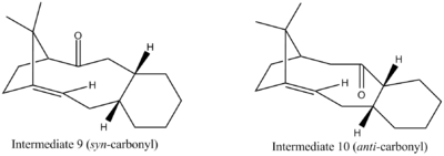 Above are the 2 possible intermediates in the synthesis of Taxol. This is an example of atropisomerism [4] [5], which describes a situation in which there are 2 long lived isomers which have a high barrier to interconversion most commonly due to restricted rotation about a single bond due to a large sterically hindered group or a ring structure that leads to a conformational lock. Molecular mechanics will be used to determine which of these isomers is more thermodynamically more stable and therefore the isomer that is predominantly involved in the synthesis of Taxol. When left at room temperature a racemic mixture of the 2 isomers will eventually produce only 1 of the geometries exclusively, either carbonyl up (syn)(intermediate 9) or carbonyl down (anti)(intermediate 10).