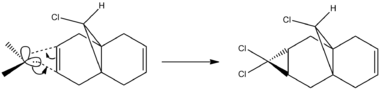 In this section the orbital control of reactivity of 2 alkene groups in dichlorocarbene is investigated using semiempirical calculations i.e. MOPACwhich moves away from a purely classical treatment and towards a quantum mechanical description. The resulting Molecular Orbital predictions will be used to show why the reaction below shows regioselectivity for the syn alkene (under the chlorine atom) rather than the antialkene.