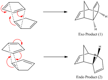 The dimerisation of the two cyclopentadiene rings to produce both the endo and exo isomers is shown below.