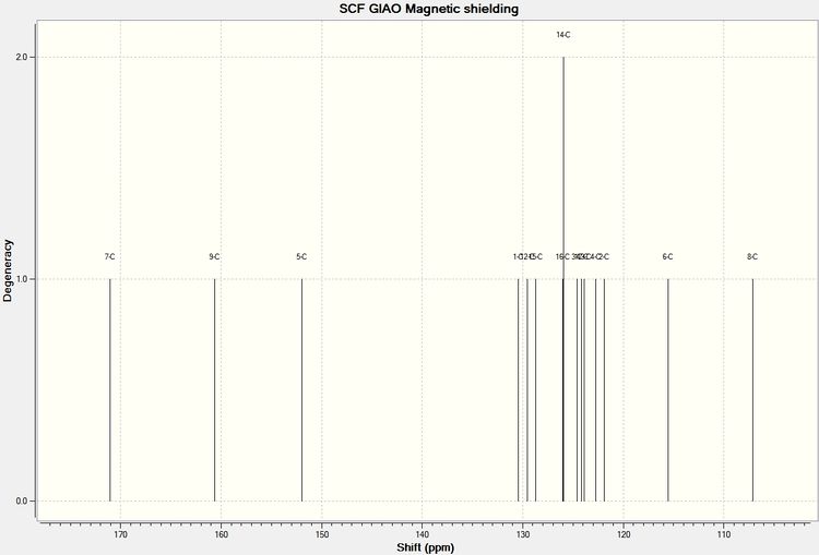 It can be seen from the difference column for each of the products that with the exception of shift at the highest ppm for each of the molecules the computational prediction agrees well the literature values, with most values within 2ppm of the literature. The reason for the high discrepancy at low field is unknown.