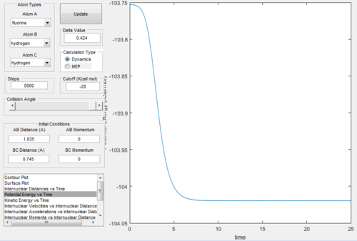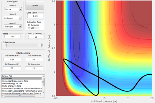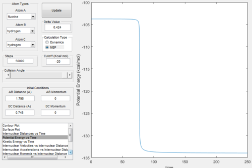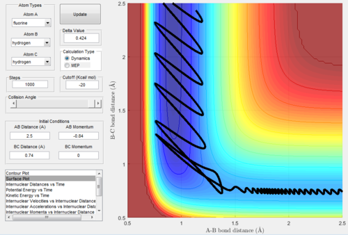 For H2 + F the reaction is exothermic and consequently the transition state is early, consequently in order to obtain a reactive trajectory a high translational energy and low vibrational energy contribution is required. In this matlab model vibrational energy is reduced by lowering pHH (the momentum of the H2 molecule thus giving it lower vibrational energy) and translational energy is increased by increasing pHF momentum term (which effectively increases the translational energy of the incoming F atom).