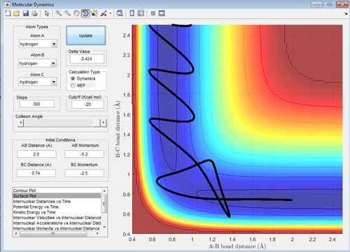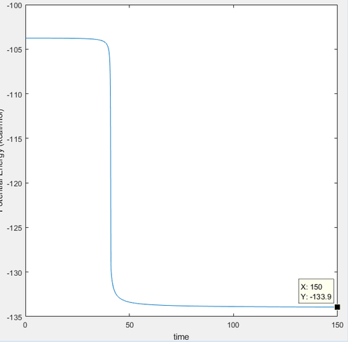 The figure below shows the potential energy vs time graph from an mep calculation. The mep calculation was done to find the lowest energy of the reactant. To optimize the mep trajectory, sequential displacement of the reactant bonds were run until the coordinate reached the minimum energy for the reactants.