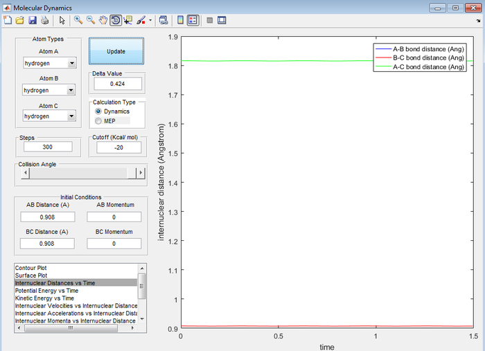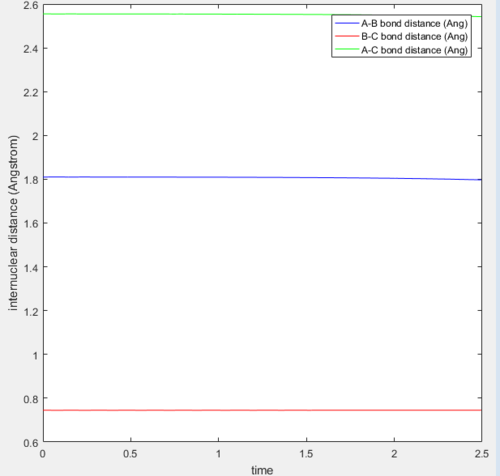 The transition state position (rts) was found to be at 0.908 Å. This was found by estimating from the surface plot which equal distance of r1 and r2 correspond to the saddle point and therefore the transition state. The value obtained was then confirmed by plotting a internuclear distance vs time plot (figure 1), showing no vibration thus implying a stationary transition state.
