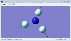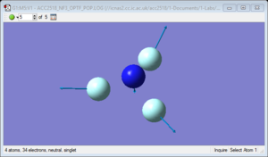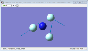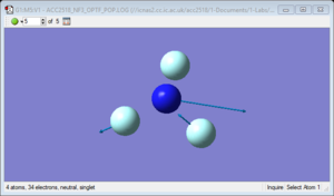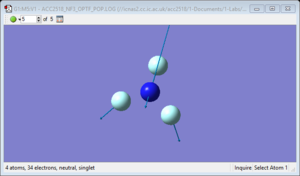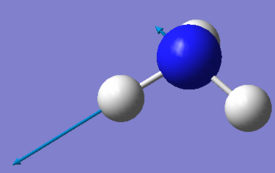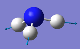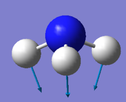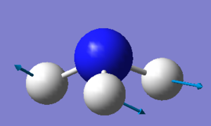 Using the 3N-6 rule, where N represents the number of atoms in a molecule, it is expected that ammonia will have six vibrational modes as shown above. There are two pairs of degenerate modes with a frequency of 1694 (cm-1) and 3590 (cm-1). The modes with a frequency of 1090 (cm-1) and 1694 (cm-1) correspond to bending vibrations and the modes with a frequency 3461 (cm-1) and 3590 (cm-1) correspond to bond stretch vibrations. The bond stretch vibration at 3461 (cm-1) is highly symmetric whilst the stretches with a frequency of 3590 (cm-1) are asymmetric. The bending vibration with a frequency of 1090 (cm-1) is known as the umbrella mode. Three bands would be expected to be seen with the two stretches at 3590 (cm-1) being too low in intensity. The bends with a frequency of 1694 (cm-1) are degenerate and only one band will be observed between the two. Hence the three observed bands would be at 1090 (cm-1), 1694 (cm-1) and 3461 (cm-1).