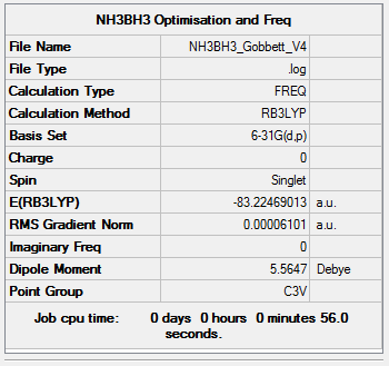 The following NH3BH3 molecule was optimised. The optimisation was then checked by frequency analysis.