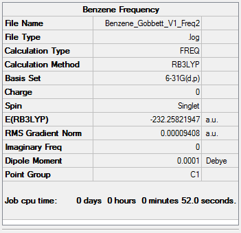 The following benzene molecule was optimised. The optimisation was then checked by frequency analysis.