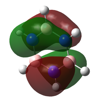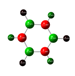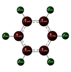 Thus it is clear that benzene and borazine share very different charge distributions. This is easy to see by eye, comparing the two images above. It is also simply explained by the Pauling scale of electronegativity. In benzene, as discussed, there is a high level of symmetry and the charge distribution is even across the molecule; a slightly electronegative centre surrounded by electropositive hydrogens. In stark contrast is the borazine molecule, in which the central ring is made up of two atoms with electronegativities above and below that of hydrogen. This also has an effect on bond length. In the benzene molecule, the C-H bond distances are all equal, as are all the C-C bond distances. In borazine, the B-N bond distances are equal due to the alternating structure of the ring, but the B-H / N-H bond distances are not the same, lowering the symmetry of the molecule. N holds the H atoms very strongly, as it is significantly more electronegative. This means it also draws electron density to itself, leaving the hydrogen with a slight positive charge. Boron, as discussed, is electropositive with regard to H and so the B-H bonds are much longer. Thus borazine has a much more varied, alternating charge structure to its isoelectric equivalent, benzene. It is worth noting that despite their different charge distributions, the two structures both have neutral overall charge. |