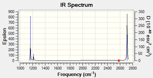 The IR spectrum shows three peaks, even though there are six vibrations. There are two reasons for this. Firstly, as the Symmetric Stretch (2579cm1) has no dipole moment, it does not show up on the IR spectrum as it is not IR active. Secondly, there are also two sets of degenerate vibrations: the Asymmetric Stretches (2712cm1) and the Bends (1213cm1). As they have the same frequency, their peaks overlap and appear as one.