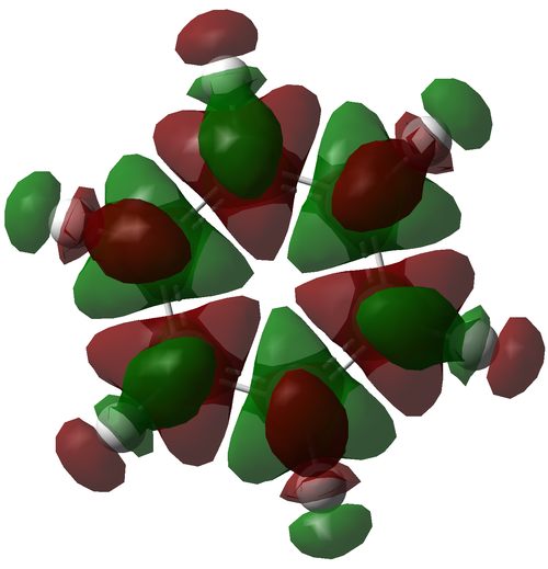 The following MOs are the 120 levels for benzene and borazine respectively. They are included for their sheer aesthetic joy, not for their relevance to any interesting chemistry. To all intents and purposes, these MOs don't exist and can't be reproduced experimentally (to a certainty of over 99.9%), but they are really pretty.