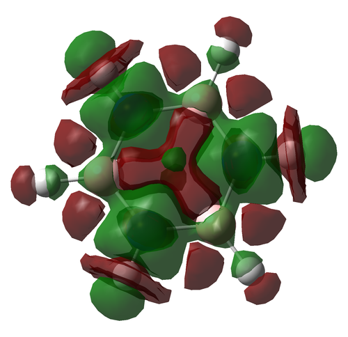 The borazine equivalent MO is composed of s-orbitals of the hydrogens and p-orbitals of either a boron or nitrogen atom. In this case, the relative size of each lobe is affected by the electronegativities of the atoms involved. Where an H s-orbital is interacting with an N p-orbital, the greater electronegativity of the N means its p-orbital is deeper in energy and so dominates the character of the interaction. In the case of the H s-orbital is interacting with a B p-orbital, it is the H that is the more electronegaive and so its s-orbital is deeper in energy. Again, the orbitals have alternating phases, suggesting non-bonding to anti-bonding character. It is due to the significantly reduced symmetry of the borazine MO that the energy difference between these two is more significant than the set above; the benzene MO is notably more symmetrical thus deeper in energy (more stable). The lobes on the inside of the ring of borazine's MO16 are due to rounding errors in the generation of the MO | ||