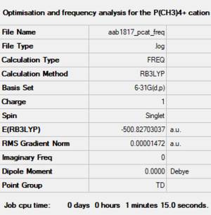 From these two tables, it can be concluded that although the cations show some similarities with their structures -both have three methyl groups attached to themselves, and the central atoms are both in group 15-, charge distribution is different. For the phosphorous cation, the positive charge is mainly located on the central atom, with some contribution by the hydrogen atoms on the methyl groups. However, for the nitrogen atom, the positive charge is exclusively spread out across the hydrogen atoms on the methyl groups.