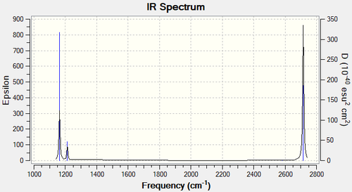 Indeed, when looking at the computed IR spectrum we observe three distinct peaks. The largest one corresponds to the 2716cm-1 vibrations, for which the individual intensity were summed up. The medium peak corresponds to the 1163cm-1 vibration and the smallest peaks corresponds to the 1213cm-1 vibration. This can be all observed in the figure below.