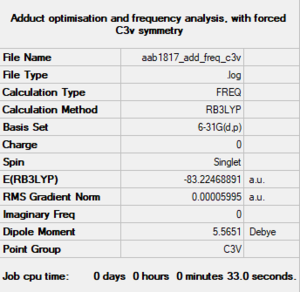 Initially, a BH3 molecule was created in Gaussview and a B3LYP/3-21G optimisation was run in Gaussian. The final optimised structure was obtained.