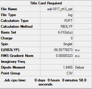 Item Value Threshold Converged? Maximum Force 0.000122 0.000450 YES RMS Force 0.000058 0.000300 YES Maximum Displacement 0.000531 0.001800 YES RMS Displacement 0.000296 0.001200 YES Predicted change in Energy=-1.653992D-07 Optimization completed.