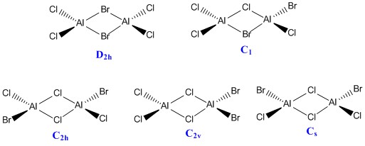 Relative energy = E(isomer 1)-E(isomer 2) = -2352.406au + 2352.416au = 0.010au = 6.275kJmol-1 The energy of isomer 2 is slightly lower than the energy of isomer 1. Isomer 2 uses Chloride atom as the bridging atom. the Cl and Al are in the same period in the periodic table, thus their sizes matches more than Br and Al. Therefore, the orbital overlap of Cl and Al is larger, giving rise to lower energy of the isomer.
