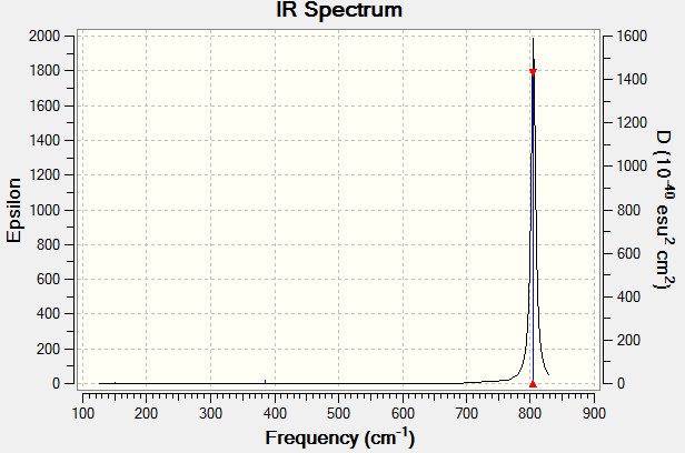 The below figure is an image of the spectrum of the BBr3. Six peaks are expected to see since there are six vibrational modes. However, there is only one peak on the spectrum. This is due to that there is no dipole change on the molecule upon bend, symmetric stretch and out-of-plane bend, thus the vibrations are IR inactive.