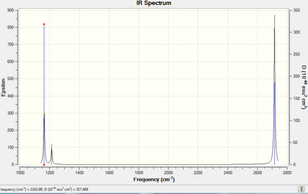 The vibrational spectrum of BH3 molecule is shown below. Six peaks are expected to see with each corresponding to one vibrational mode. However, only three peaks can be seen on the spectrum. The two bend peaks have the same fequency, which lead to the two peaks are present as a whole, same for the two peak correspond to asymmetric streches (same frequency). The symmetric stretch is not IR active since there is no dipole change upon vibration, thus there is no peak on IR spectrum.