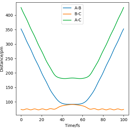Adjusting the initial geometry to AB=91.8 from AB=BC=90.8 nudges towards the reactants, hence reactants form. AB plateaus at 5.07, BC oscillates at 3.21. Distance/time calculations show BC oscillates at 74.02, whilst AB increases to 352.63.