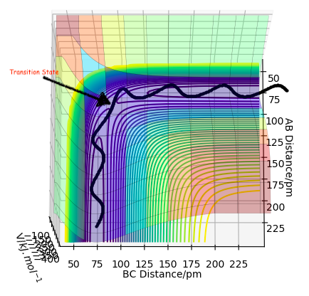 -5.1 | -10.6 | -349.477 | YES | Kinetic Energy supplied is enough to overcome the activation energy, and the transition state, to break the BC bond and therefore form the AB bond, as seen in the contour plot to the right. But here there is even more energy supplied, which is why the trajectory circles round the transition state area, moving to a higher potential energy surface, Careful with wording: The potential energy surface is always the same - you can't leave it. Fdp18 (talk) 15:32, 16 May 2020 (BST)