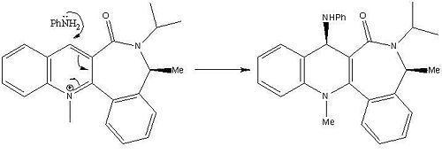 The absolute stereochemistry observed is due to streic effects rather than electronic effects (observed for molecules 5 and 6). As the conformation with the global minimal energy depicts the carbonyl pointing down below the plane of the pyridine ring, this allows for an unhindered nucleophilic attack on the carbon in the 4-position from above the plane of the molecule. As a result the NHPh group is delivered to the top face of the molecule, anti to the carbonyl group. The high stereoselectivity is achieved due to the NHPh group being bulky and so is forced to attack from the opposite side of the molecule to where the carbonyl group is located so to avoid steric clash between them which will destabilise the molecule.