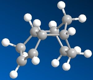 Hydrogenation the endo dimer (2) results in the formation of two possible dihydro derivatives, molecule 3 or 4. Using molecular mechanics, it is possible to predict which of the two double bonds in molecule 2 is hydrogenated more easily through the calculation of the relative energies of the products formed. From this a prediction can be made as to which of the two dihydro products is formed based on thermodynamics. The energies of the two dihydro products were calculated using the same method as described above. It was calculated the products 3 and 4 have an overall energy of 149.3 kJ/mol and 130.4 kJ/mol respectively. This indicates that dihydro product 4 is the most stable as it has the lowest overall energy and hence is the thermodynamic product. The individual energies displayed in the table give an indication why product 3 is less stable than product 4. The largest difference in energy comes from the 'bend' contribution to the total energy. The energy associated with a 'bend' is that arising from stretching or compressing the bond angles, within a molecule, from their optimum sizes. The result is an increased amount of strain associated with the molecule when it adopts that particular conformation and hence causes the overall energy of the molecule to increase and it's stability to decrease.