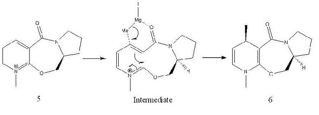 The conformation of "Molecule 5", shown, gave the lowest total energy of 240.6 kJ/mol. As the picture shows, the most stable geometry is when the carbonyl oxygen is orientated above the plane of the pyridial ring. The reaction scheme below rationalises the stereochemistry shown in product molecule 6 from the methylation of molecule 5, using methyl magnesium iodide, in the 4-position. Magnesium is electropositive and hard, the carbonyl oxygen is electronegative and also hard. Therefore it is favourable for the Grignard magnesium to coordinate to the carbonyl oxygen as depicted in the intermediate species, shown above. Methylation of the aromatic ring in the 4-position therefore occurs through an intramolecular reaction via a 6-membered transition state and the metlyl group is delivered on the same face as the carbonyl oxygen (above the plane of the pyridial ring). The selectivity of the above reaction is relatively high using methyl magnesium iodide and is stated to be 19:1 in the literature. However, if the methyl group was to be replaced with a group of increased steric bulk the regio-selectivity of the reaction can be increased up to 99:1[1].