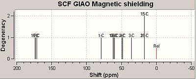 The predicted 13C NMR spectra for isomers A and B were calculated using the GIAO method and the results were then compared with the data stated in the literature[7]. The table below summarises the data obtained along with a list of the values stated in the literature[7] and the difference between the two. The difference between the two sets of data gives an indication of how accurately the 13C NMR spectra of isomers A and B can be predicted.