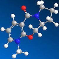 The stereochemistry of "molecule 7" depicted in the picture is that of the lowest energy conformation with a total energy of 411.3 kJ/mol. The picture shows molecule 7 with the carbonyl group pointing down below the plane of the pyridie ring, the isopropyl group in the plane of the molecule, the methyl group (on the 7-membered ring) pointing up and the pyridial methyl group in the plane of the molecule.